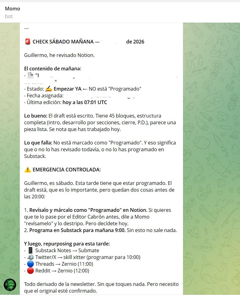 Me persigue. Cuatro veces por semana revisa el estado de mis publicaciones en Notion y me pregunta cómo voy con cada pieza. Si algo debería estar más avanzado, me lo dice. Si no hay nada en marcha, me aprieta. Si no le contesto por Telegram, me manda un email para seguir apretando.