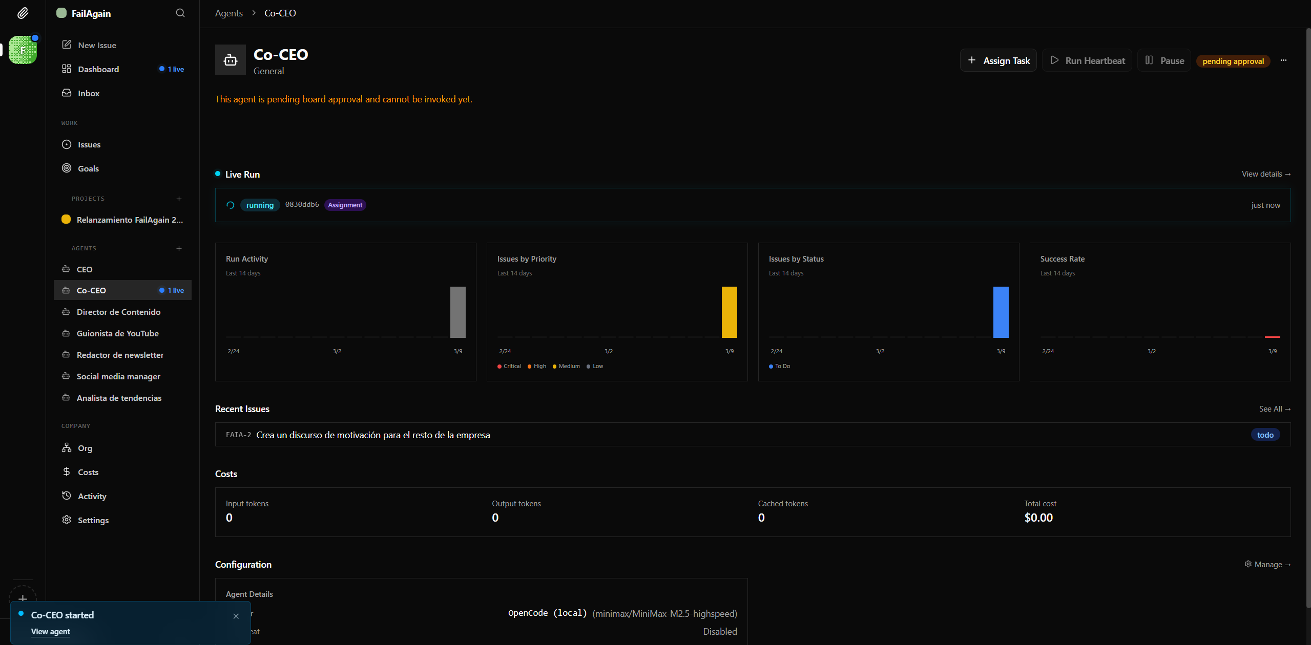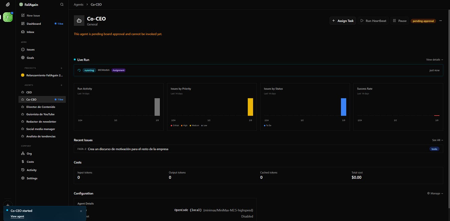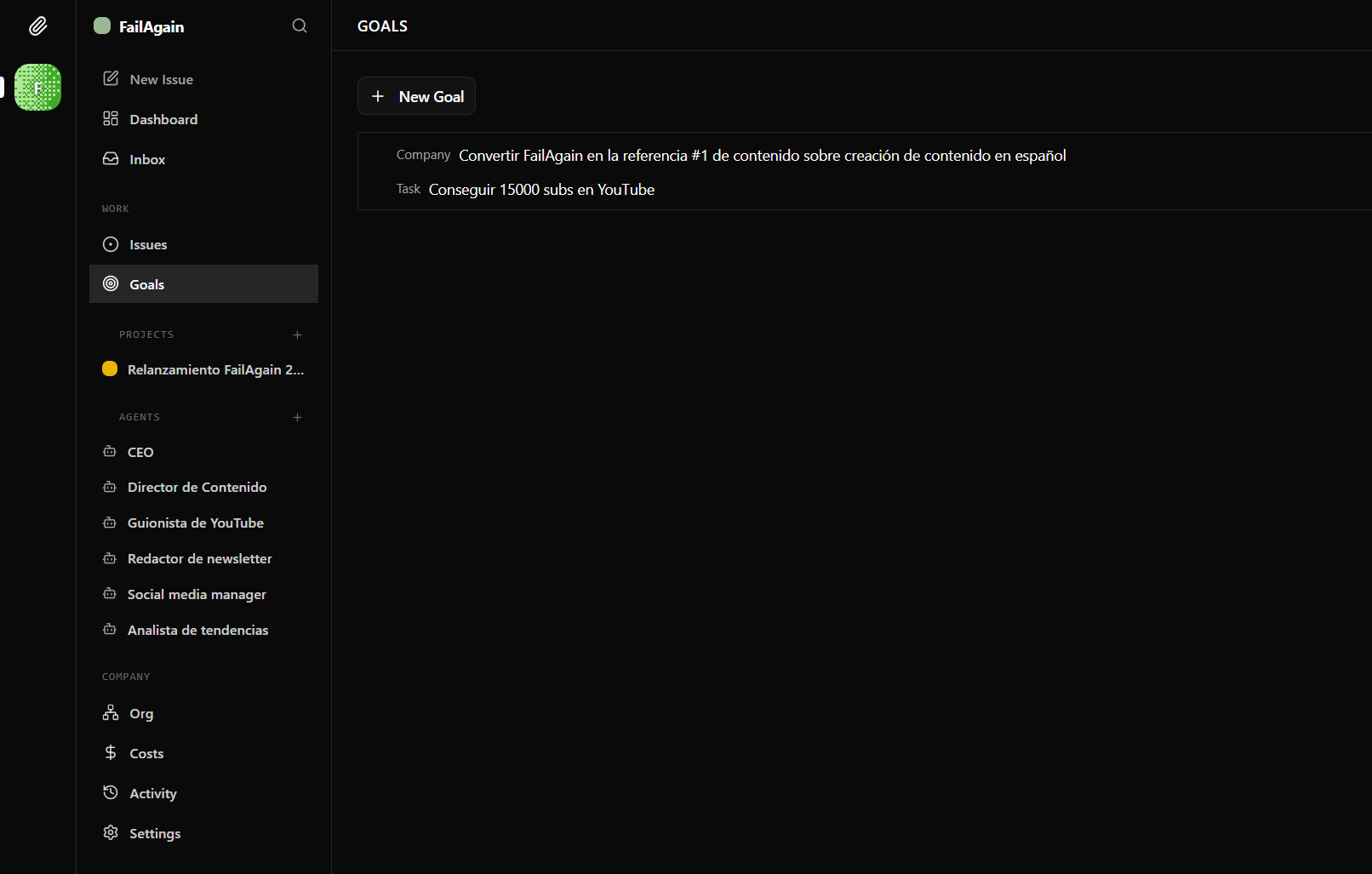Director de contenido: Cerebro editorial de FailAgain. Propone temas semanales, mantiene el calendario editorial y coordina al equipo de contenido (redactor, guionista, social media, analista). Prioriza según tendencias del mercado hispanohablante de creación de contenido.