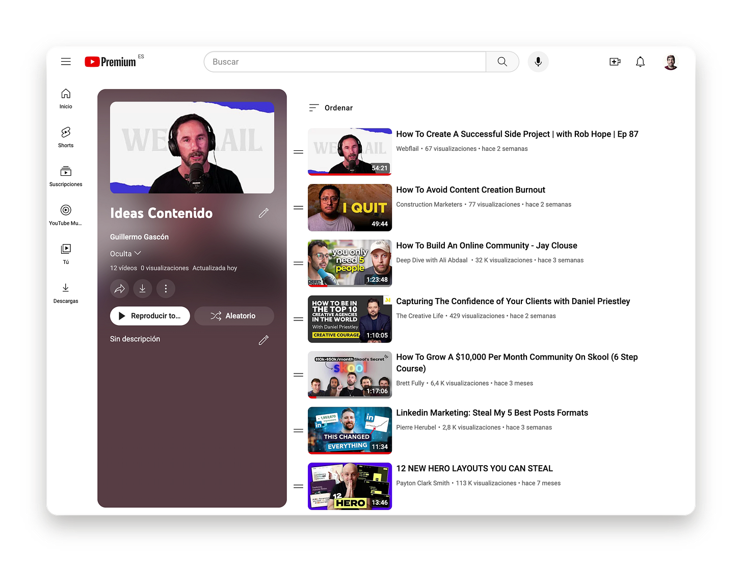 En el caso de YouTube, he creado una lista de reproducción oculta que llamo “Ideas contenido” (muy original) y en ella voy metiendo vídeos que me dan pie a desarrollar una idea posteriormente. Muchas veces no tengo por qué haber visto el vídeo, simplemente se me cruza en el camino mientras veo otro contenido y lo guardo para revisarlo más adelante.