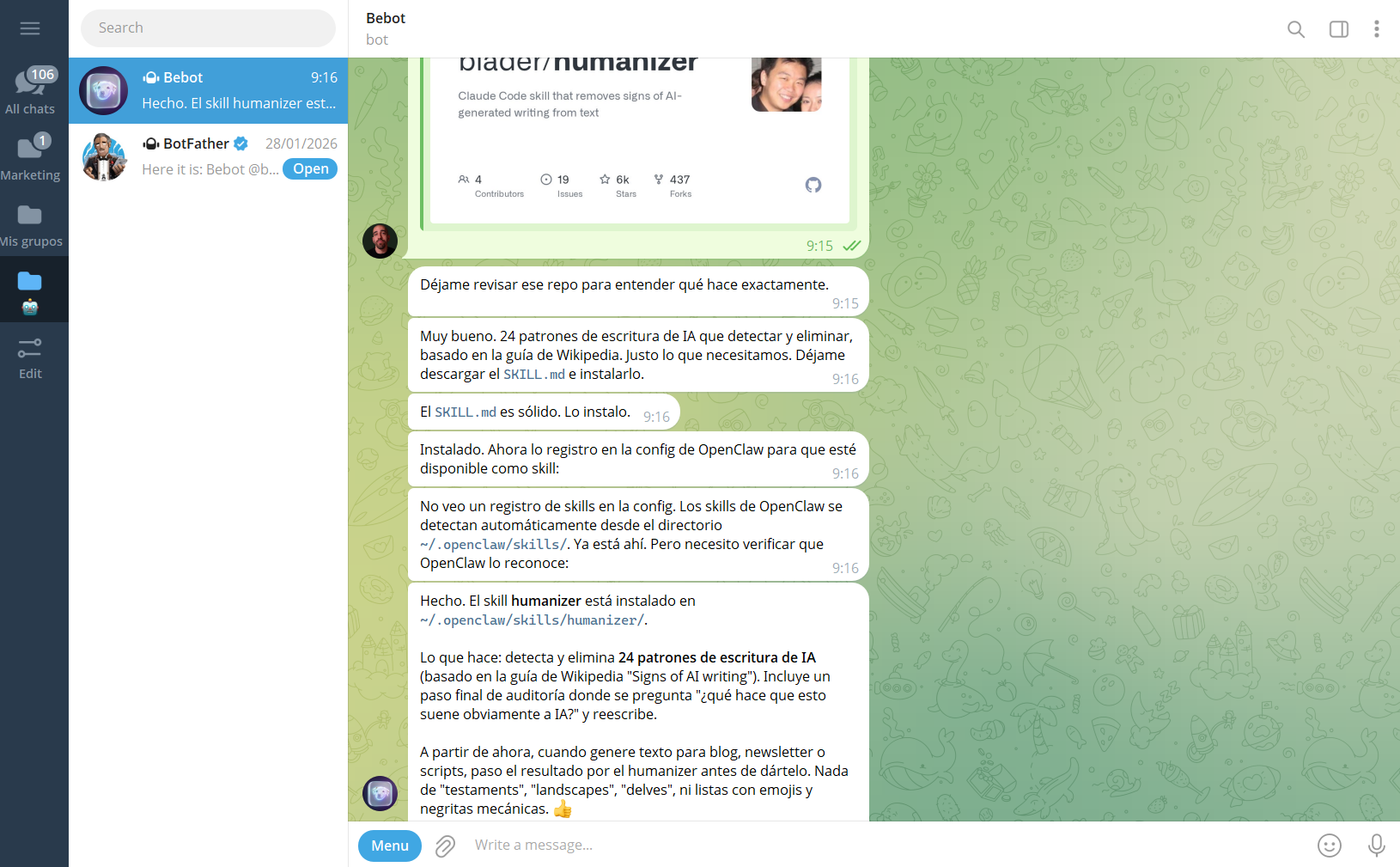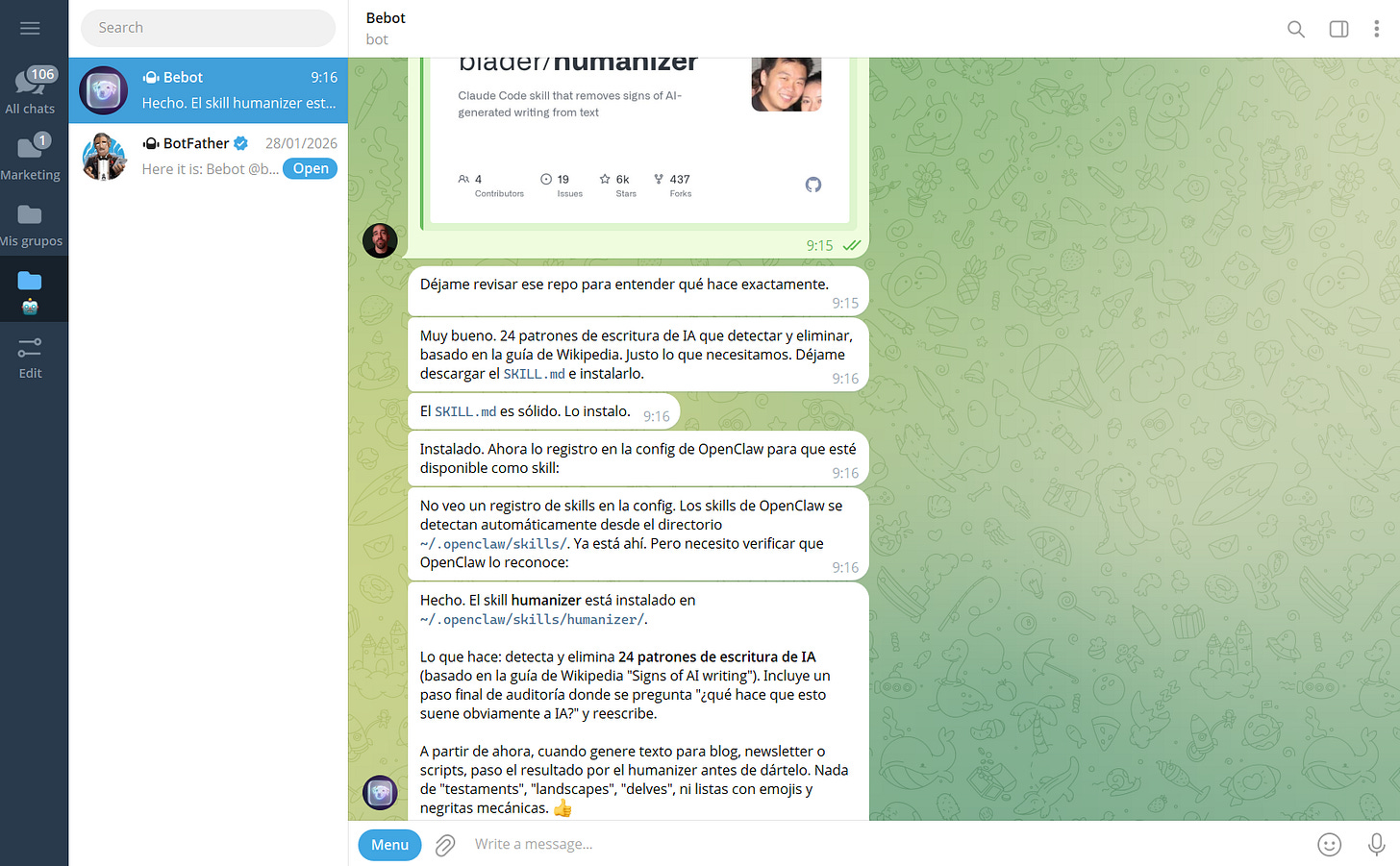 Conectas OpenClaw a Telegram. A partir de ahí tienes un asistente al que puedes escribirle como si fuera un compañero: “redáctame una estructura de post sobre…”, “busca información sobre ese creador”, “resúmeme este artículo”.